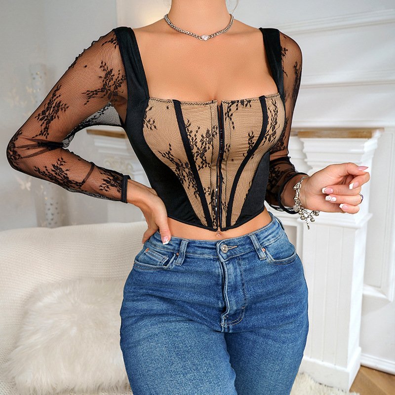 Fishbone Corset Sexy Lace Splicing Square Collar Inner and Outer Top